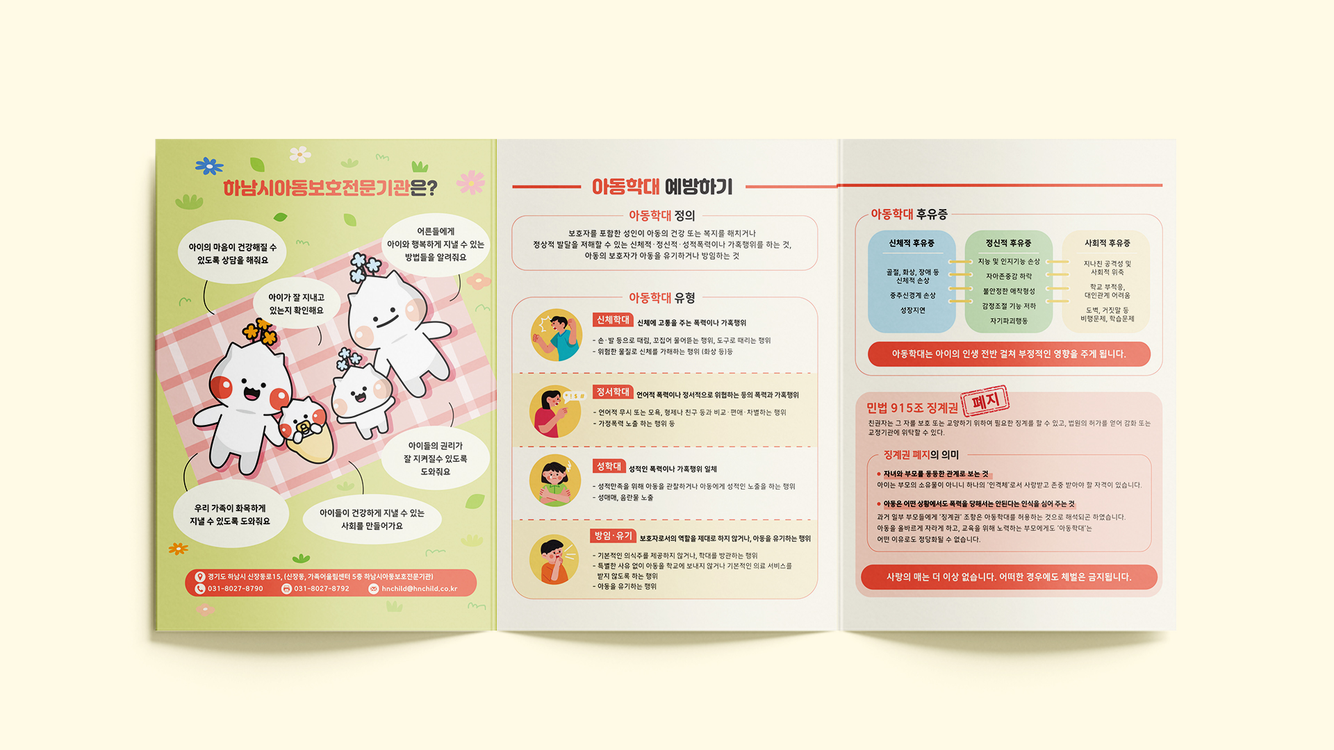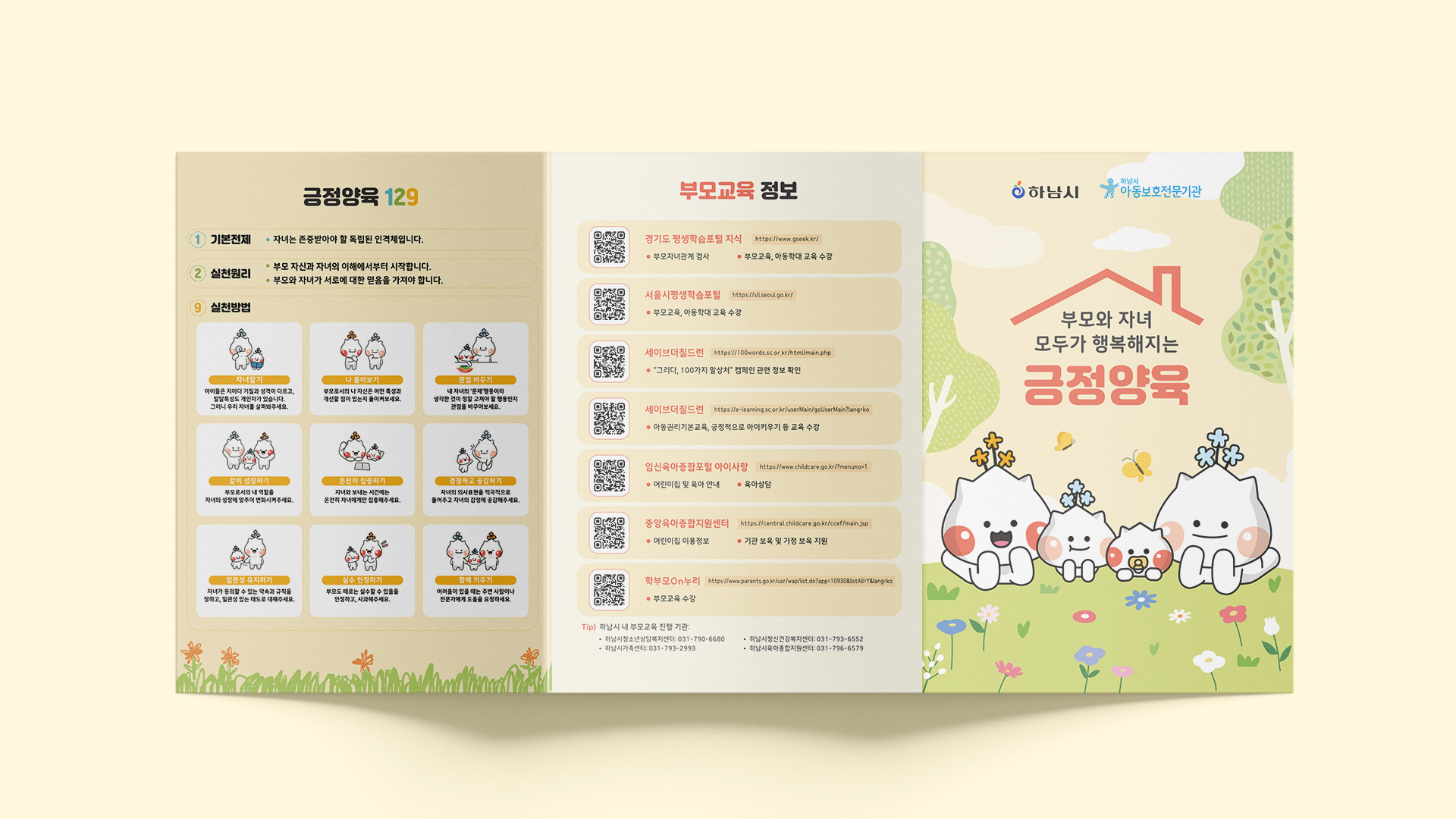 하남시아동보호전문기관 하남시 아동보호전문기관의 긍정양육 리플렛 디자인입니다. 부드러운 파스텔 톤과 하남시 마스코트를 사용하여 따뜻하고 친근한 분위기를 표현했습니다. Date: April 11, 2025 Services: LEAFLET